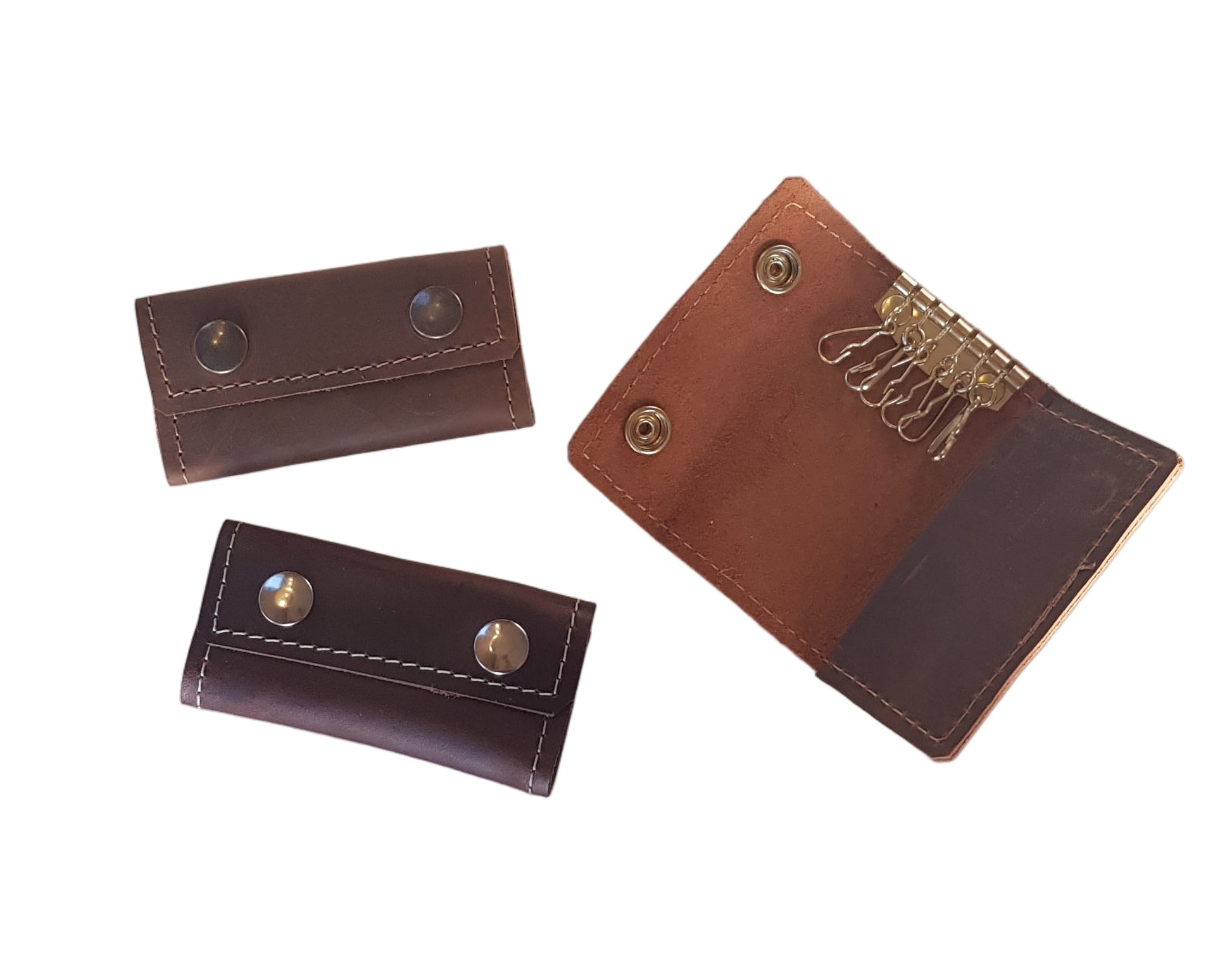 Diese handgefertigten Schlüsselmappen aus robustem Echtleder bieten eine elegante und praktische Lösung zur sicheren Aufbewahrung Ihrer Schlüssel. Sie verfügen über mehrere Metallhaken im Inneren sowie einen zuverlässigen Druckknopfverschluss. Die saubere Kontrastnaht und die stabile Verarbeitung machen jede Mappe zu einem langlebigen Begleiter für den Alltag.